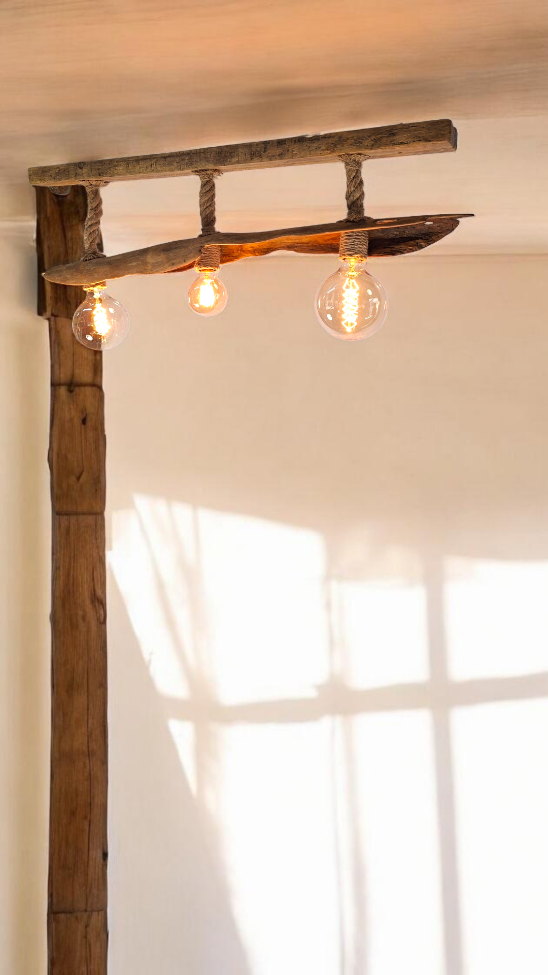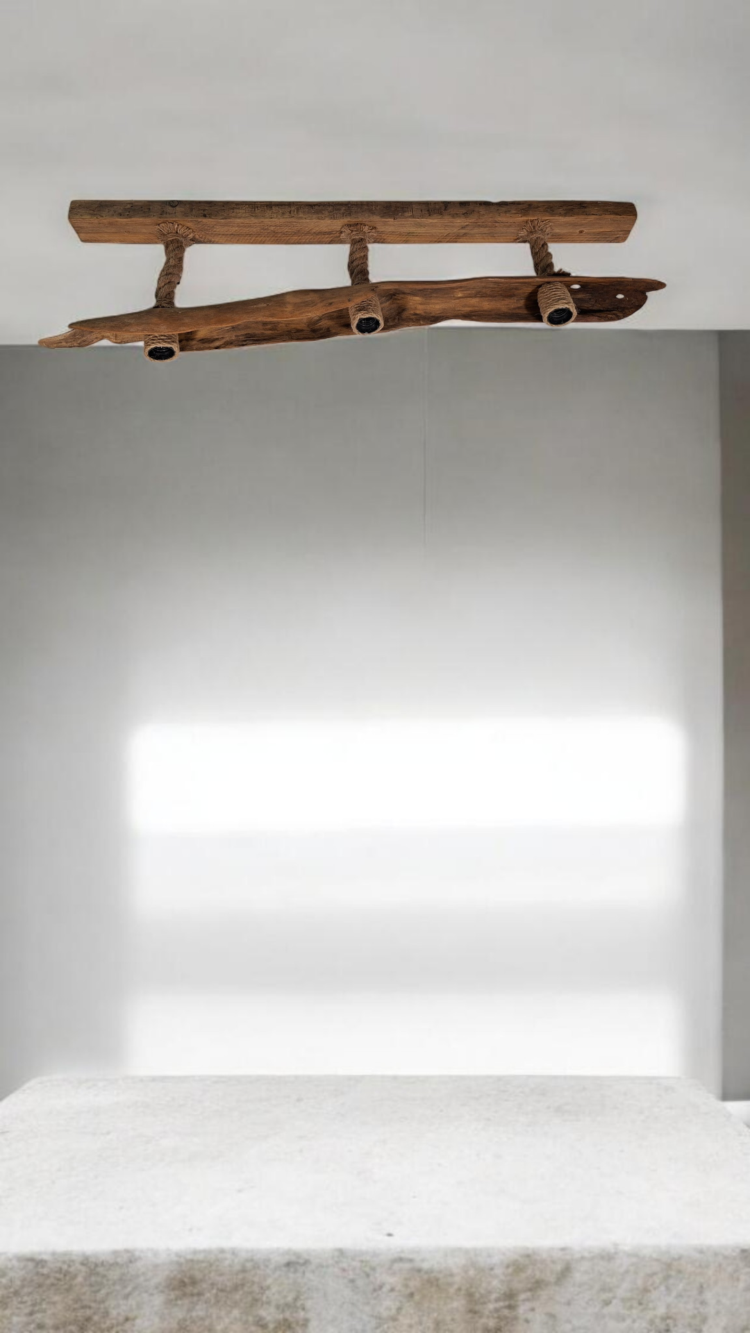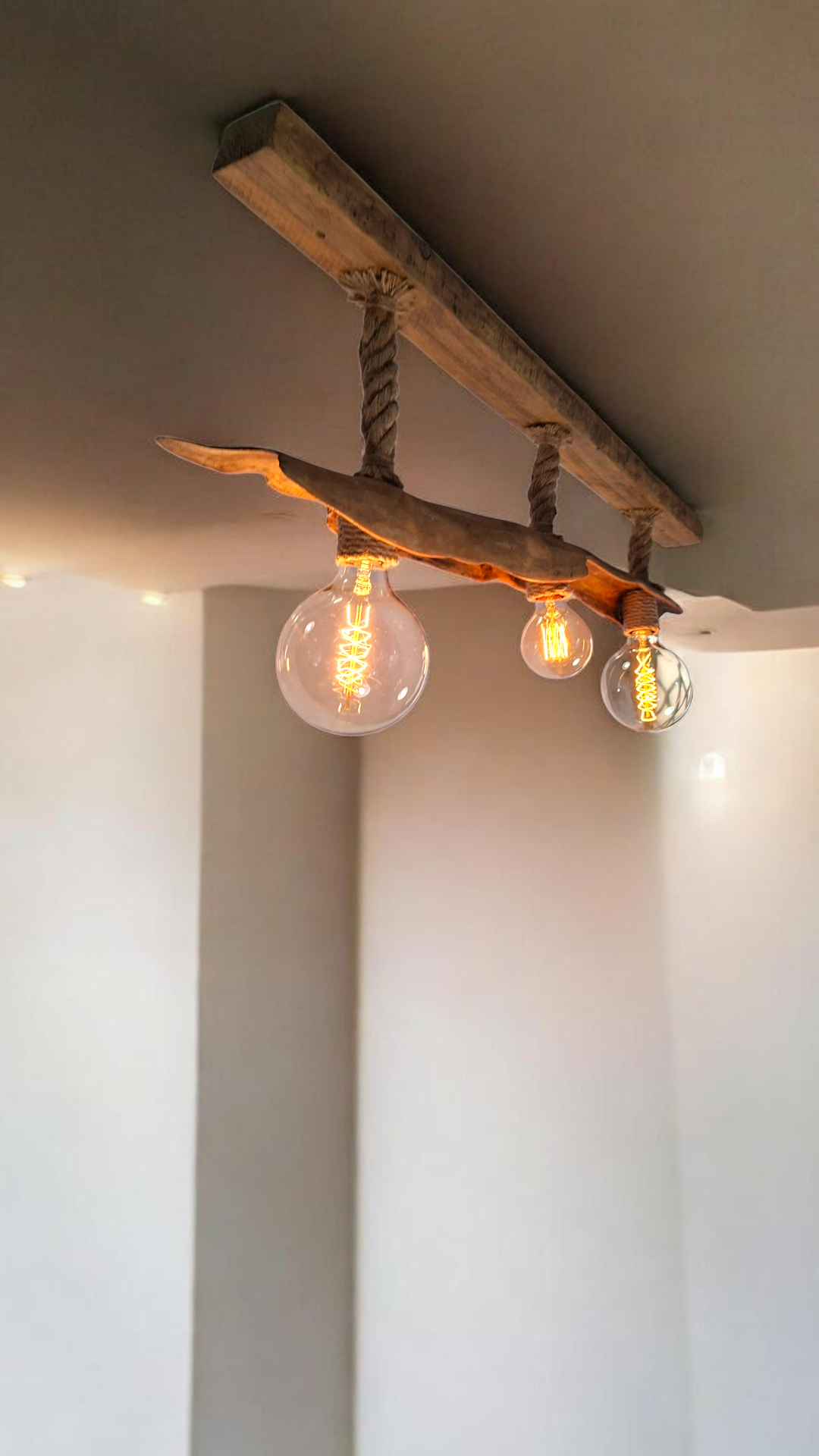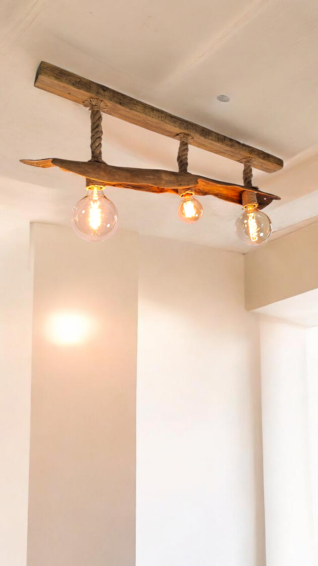 Lámpara de techo de 110cm. Con un diseño único y artesanal, elaborada con madera natural y cuerda.
