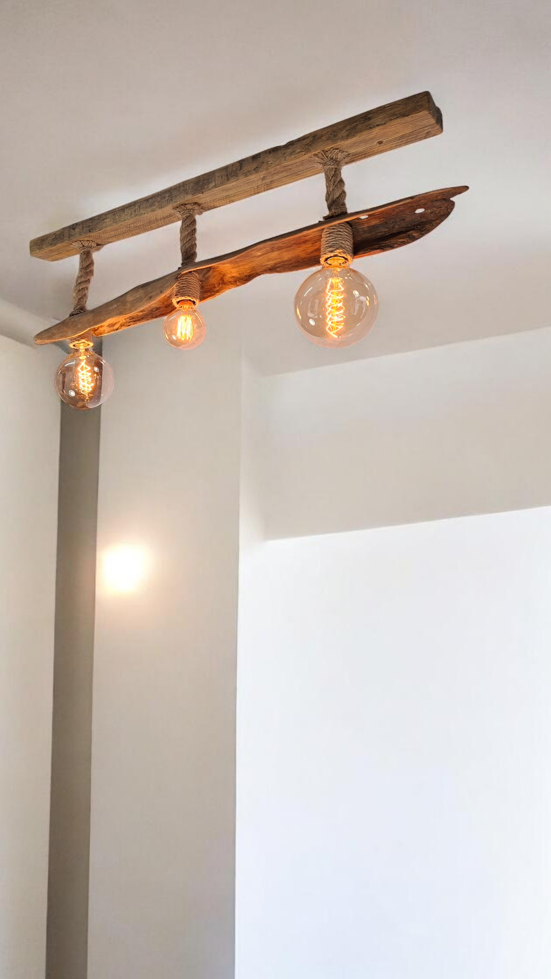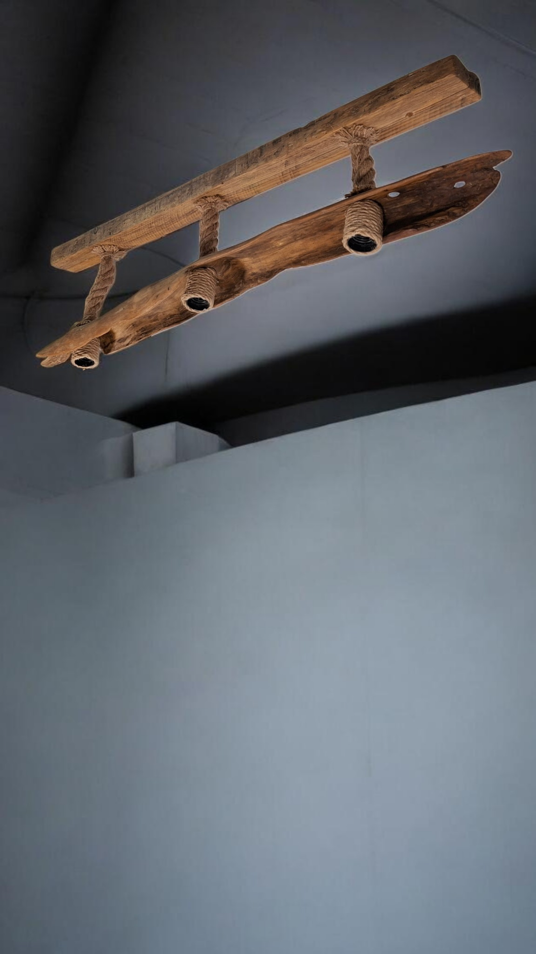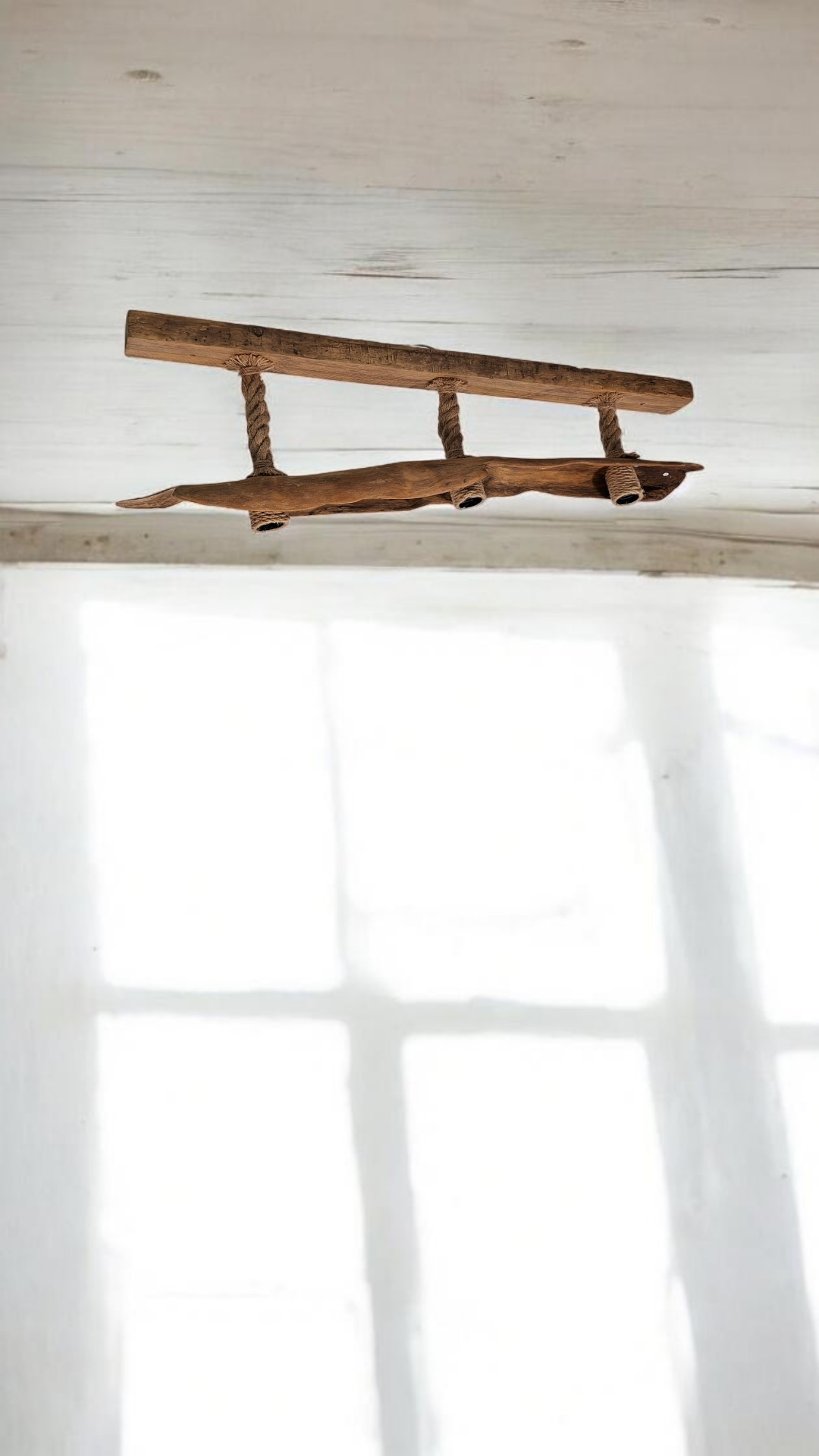 Lámpara de techo de 110cm. Con un diseño único y artesanal, elaborada con madera natural y cuerda.