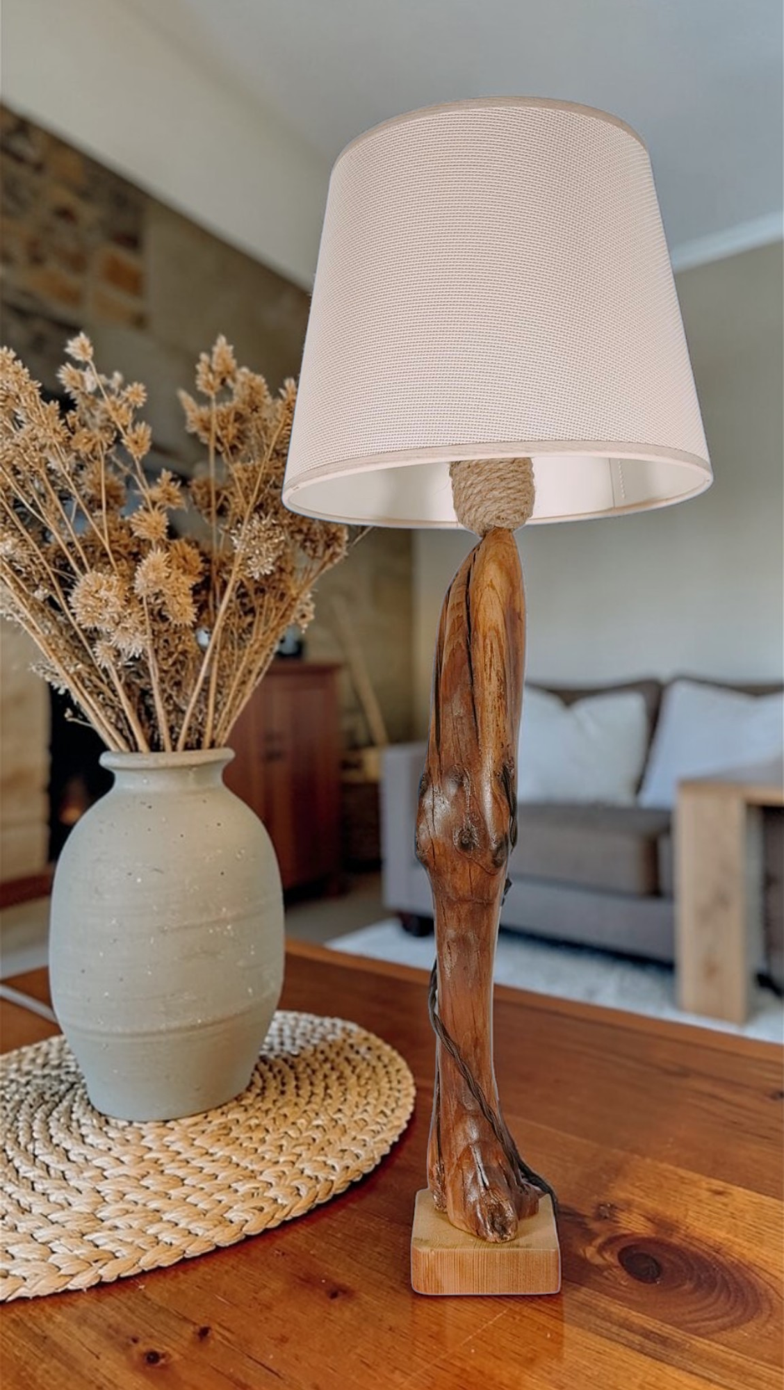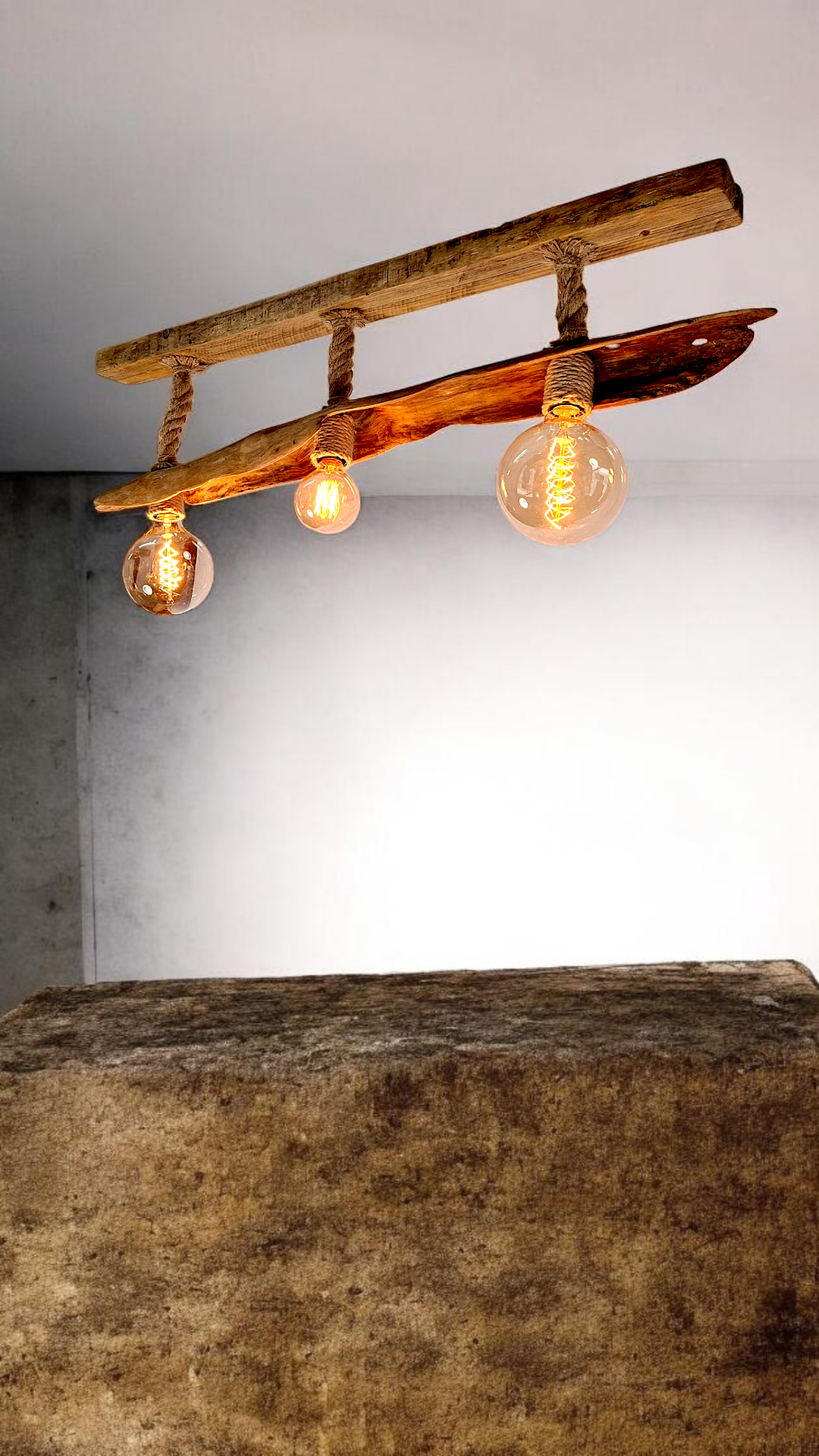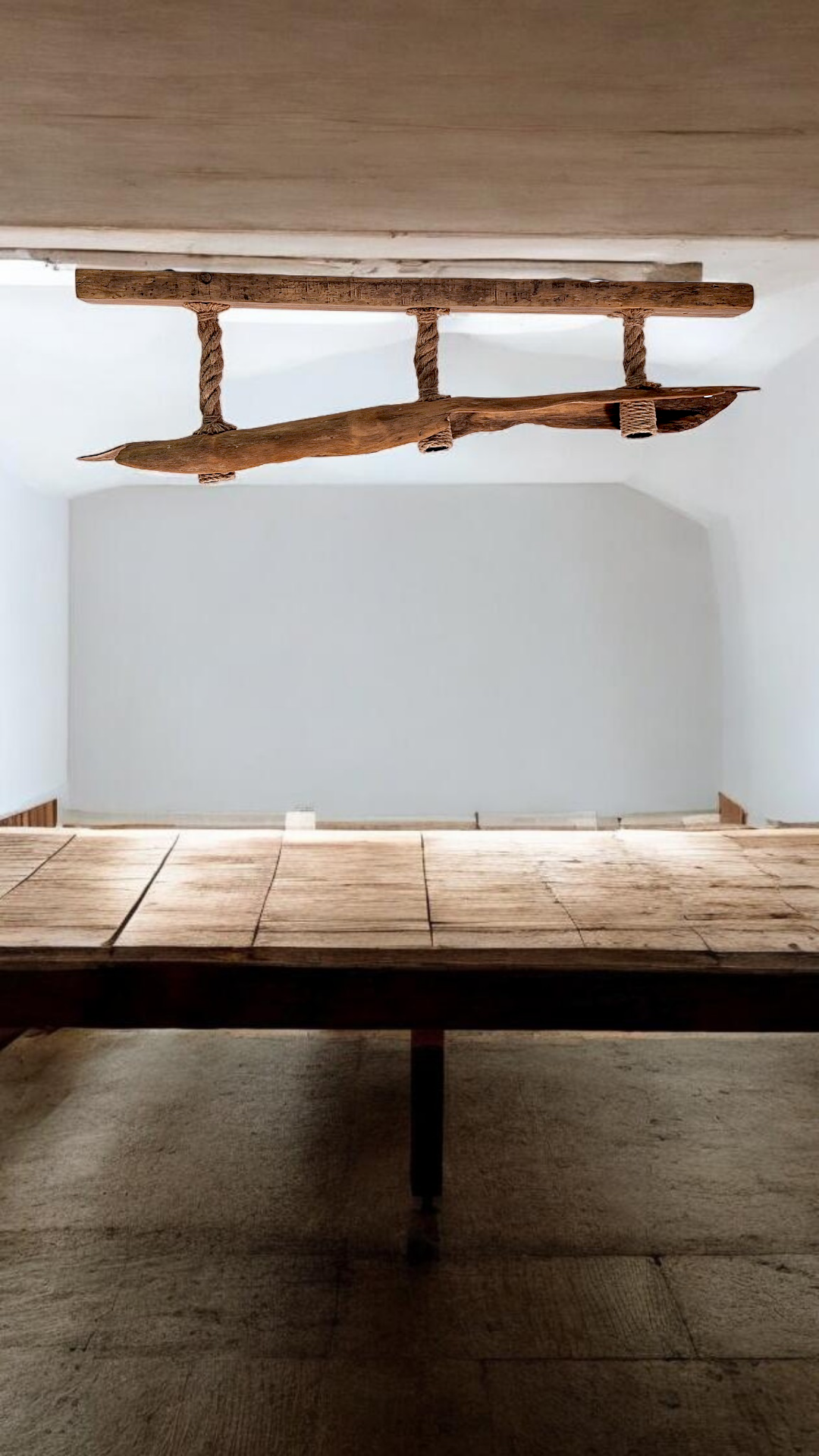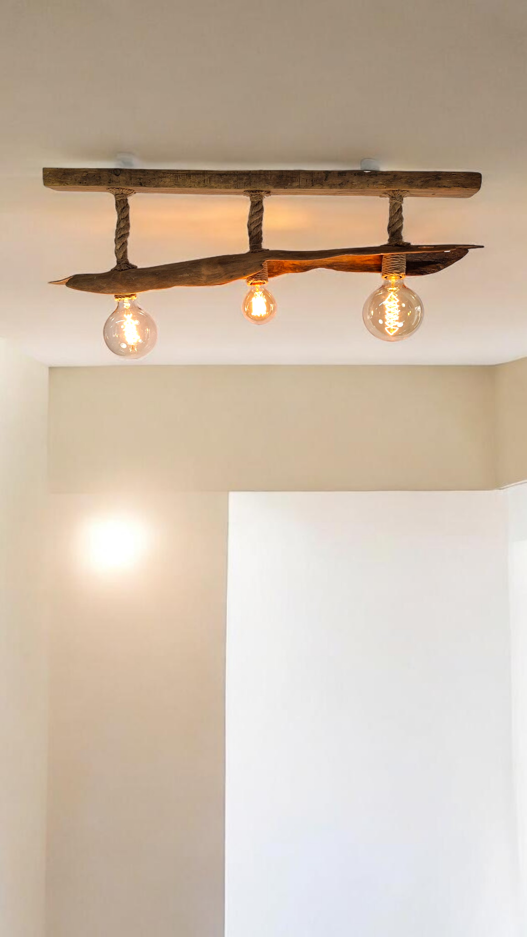 Lámpara de techo de 110cm. Con un diseño único y artesanal, elaborada con madera natural y cuerda.
